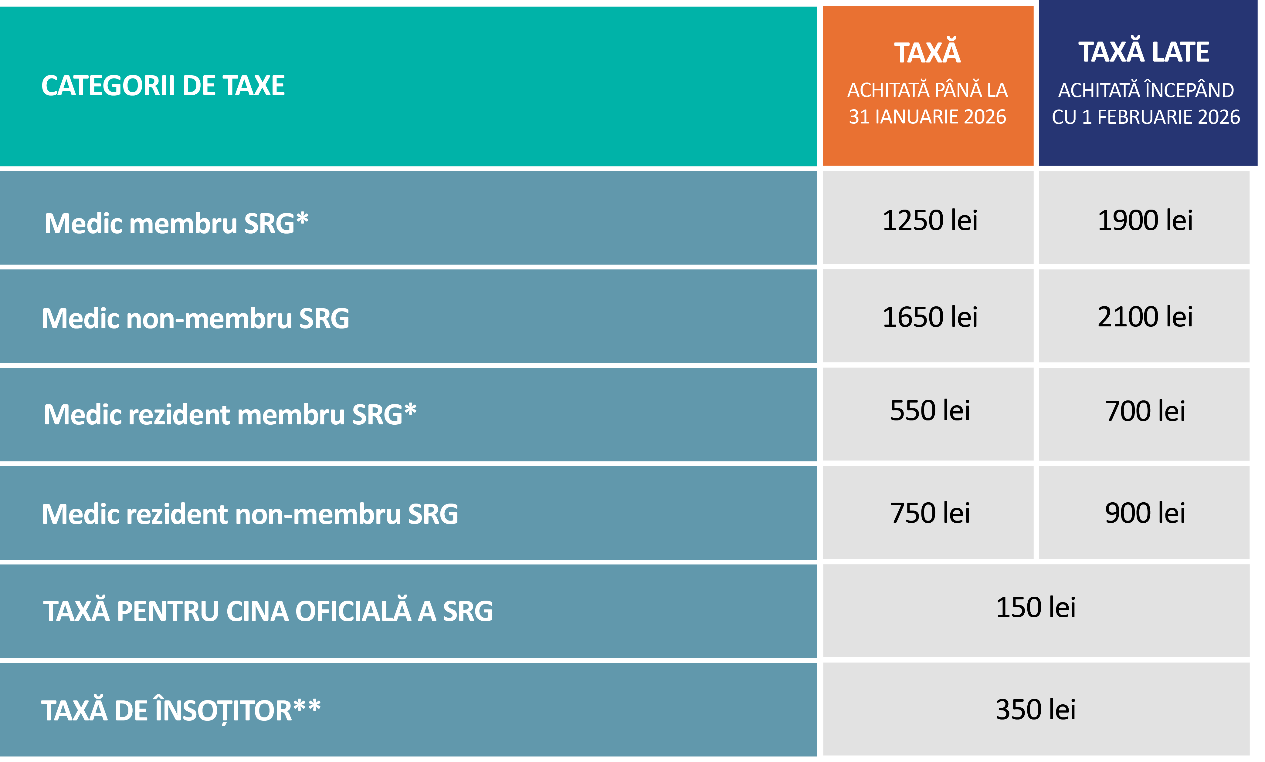*Taxele reduse se aplică doar membrilor SRG cu cotizația de membru achitată la zi, în momentul înscrierii